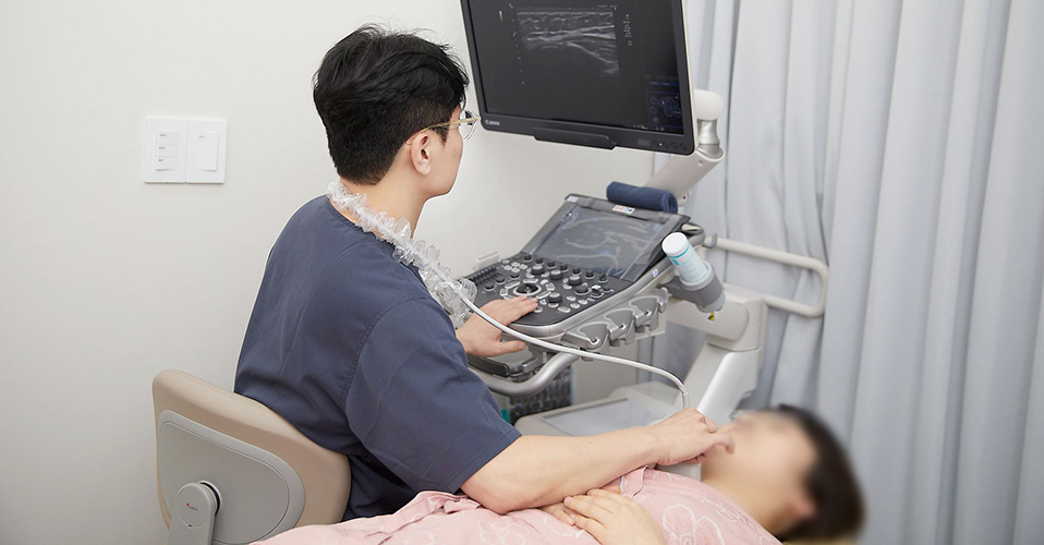 편하게 누운 자세에서 양쪽 유방에 대해 초음파를 이용하여 전체 유방을 실시간으로 검사합니다. 특히 초음파 검사는 방사선의 사용 없이 인체에 무해한 초음파를 이용하여 유방의 양성 혹(섬유선종), 악성 혹(유방암), 물혹(낭종) 등을 구분하는데 정확도가 매우 높습니다.